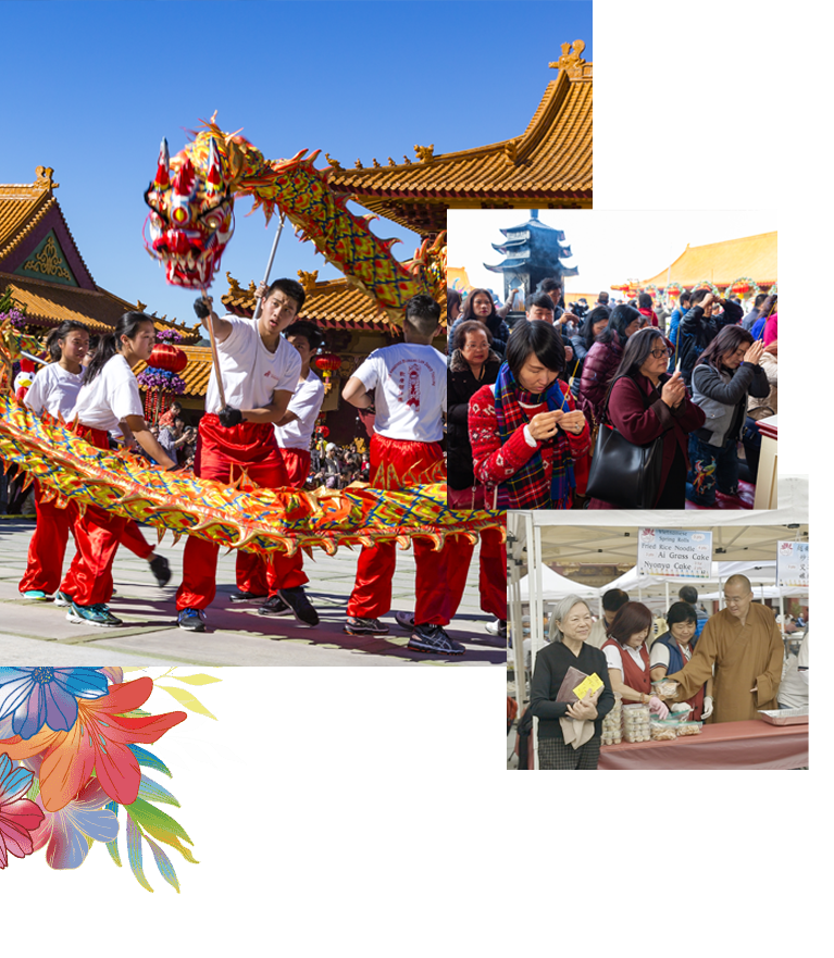 Hsi Lai Temple's 2023 Lunar New Year Food Fair will showcase the traditional to the exquisite, with various styles of vegetarian food, allowing you to taste a different kind of plant-based cuisine. On the first and second days of the Lunar New Year, there will be many special food stands gathered for two consecutive days, so that your New Year’s outing will not be boring! The food stands are located in the parking lot in front of the Bodhisattva Hall, so you can eat wherever you go!