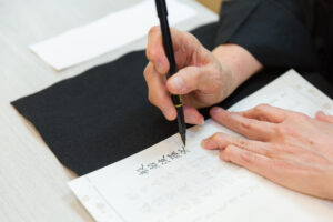 我今天以恭敬虔誠的心書寫經文,我用來寫經的水是大悲智慧之水,墨是去除煩惱的定墨,將這二者合而爲一,祈望將經文的實相法身寫出來,將佛法的真理,藉由文字表現出來,如此一來這些文字就是過去、現在、未來三世諸佛甚深的秘藏,也是如來三身真實的顯現。祈求藉由此項修持,幫助我進入悟境,實踐六度法門;藉由此項修持所具足自行、化他的功德,將我與一切衆生導向修行,讓我與一切衆生能夠消滅過去所造的種種罪業,臨終時能夠心不顛倒,具足正念,往生淨土,趨證菩提。