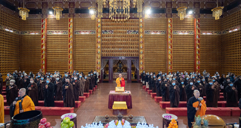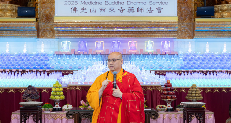 西來寺社教本土組慧澤法師主法 主法拈香。 功德主代表獻花。 上午雖然天侯不佳,氣溫驟降,大眾仍準時與會。 大眾祈求以藥師佛的願力來轉化人生。 西來書院同學一同精進修持。