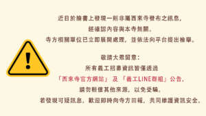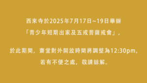 欣逢阿彌陀佛聖誕,本寺特於西元2025年12月21 ~ 28日,啟建「彌陀佛七法會」,並於佛七圓滿日﹙12月28日下午1:30﹚施設《中峰三時繫念》佛事一堂。以此精進念佛七永日之功德,回向世界和平,人民健康,檀那福慧俱增;祈佛威德,願歷代祖先往生彌陀淨土。此外,為鼓勵信眾精進修持,法會期間也將舉辦 「精進誦經」及「念佛千萬聲」的修持活動。