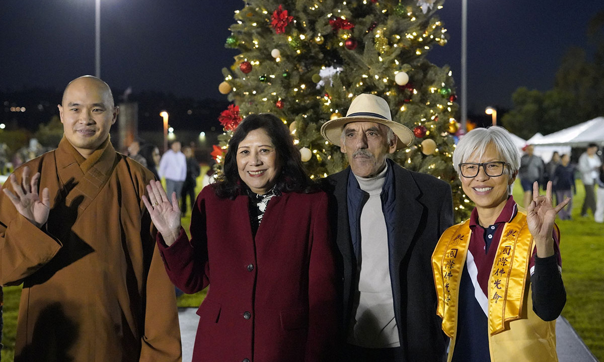【人間社 潘青霞 美國洛杉磯報導】「5、4、3、2……」在洛杉磯縣第一區縣政委員 Hilda L. Solis 帶領孩童倒數聲中,哈崗區威廉斯坦梅茨公園(William Steinmetz Park)12 月 4 日晚間舉行「親子公園嘉年華」(Holiday in the Park),以剪綵與點燈揭幕,並打造三座冰雪場,約 700 名民眾參與。佛光山西來寺社教本土化組慧澄法師與國際佛光會洛杉磯協會副會長許珍蓉帶領 13 位佛光人,設立攤位傳達「三好」,讓人間佛教的溫暖在冰雪夜色中綻放。