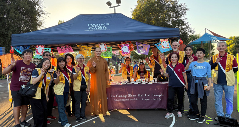 洛杉磯縣公園康樂部門主管Michael Hamilton、西來寺社教本土化組慧澄法師與佛光人Raymod Adsitt伴演的三好沙彌合照。 「火車來囉!」小朋友的歡呼聲四起!主辦單位洛杉磯縣公園康樂部門安排火車在公園內鳴著汽笛、噴著蒸汽、閃著燈光繞行,大小朋友皆可搭乘。 傍晚時分,親子同遊人潮逐漸湧現。 民眾闔家開心地與三好沙彌合影。 11歲佛光人Issac…