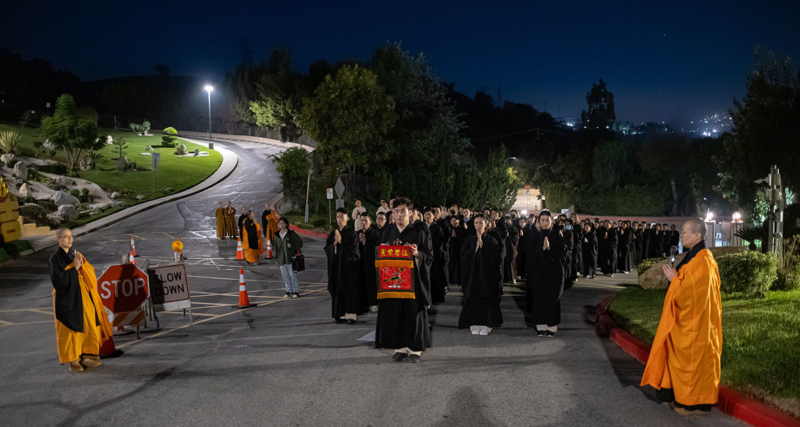 佛光西來書院23位學員也加入朝山行列。 朝山隊伍行經第一停車場,轉入五聖殿時兵分二路。 朝山隊伍行至五聖殿後方。 朝山隊伍行經成佛大道,大眾同步虔誠禮拜。 朝山隊伍中出現小朋友的蹤影,令人讚嘆! 西來分會本土人士也全程參與朝山。 主法慧澄法師以帶領大眾恭讀〈朝山祈願文〉。…
