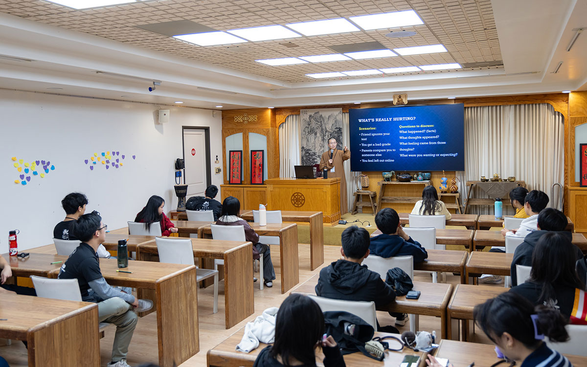 佛學課程中,佛光青年一團輔導法師知行法師為青年系統性介紹「四聖諦:苦、集、滅、道」,引導學員理解生命中苦的本質、煩惱生起的因緣,以及離苦得樂的修行方向,並鼓勵青年將佛法智慧運用於日常生活,作為面對挫折與困境的重要依止。第二天的佛學課程則由佛光青年Richard Yeung主講,延伸無常與因緣的觀念,並結合自身經驗,引導青年在焦慮與壓力升起時,先停下來覺察呼吸與身心感受,學習轉換角度看待困境,與自己的心和平共處。