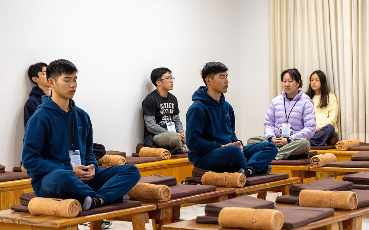禪修課中,知行法師帶領學員進行易筋經、行禪與禪堂靜坐。青年透過將杯子平穩置於頭上緩步行走,練習將注意力安住於腳下與當下;於禪堂中以數息法覺察呼吸,標記念頭與情緒,即使外在聲音出現,也不隨境轉,培養正念與專注的能力。