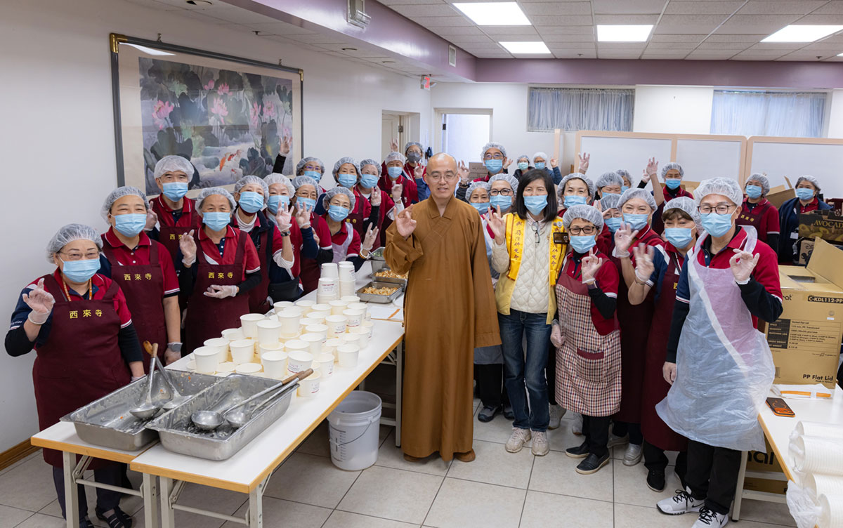 佛光山西來寺住持慧東法師及國際佛光會洛杉磯協會會長蔡月琴前來關心臘八粥分送情況,並與督導們合影。