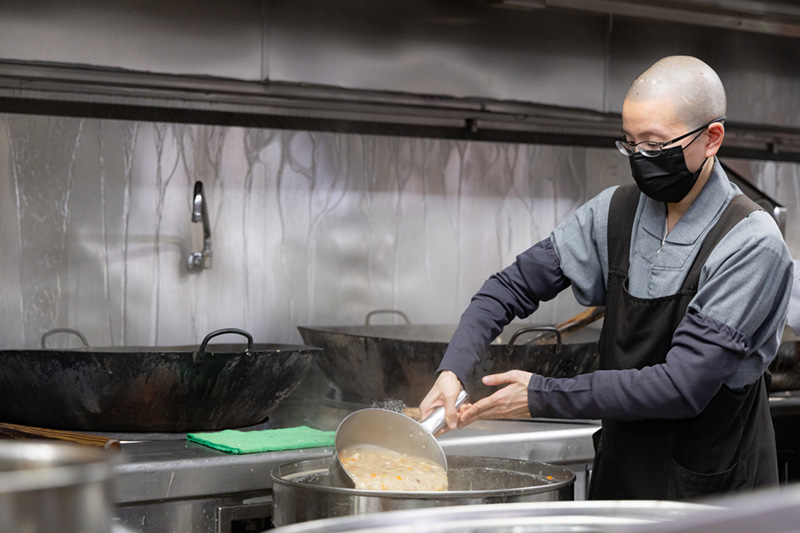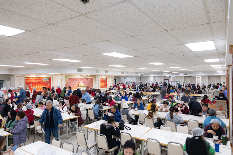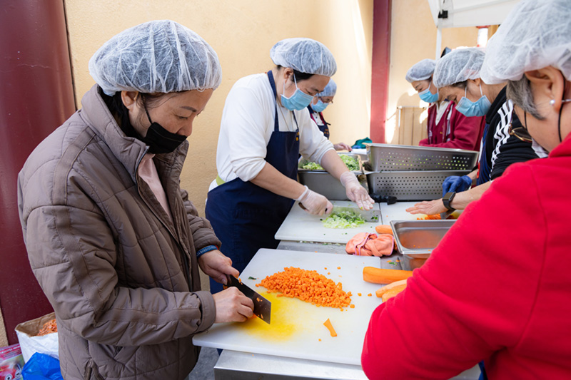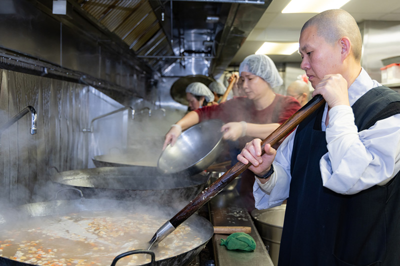 大寮義工菩薩自清晨2點開始備料,頭單監院如松法師、二單監院知行法師、社教組長覺皇法師、餐飲組如功法師等僧信二眾4點半便開始烹煮臘八粥,百餘名義工分工合作,各司其職,有人切菜、有人引導動線、有人盛粥、有人打包。男女老少、各族裔的民眾齊聚一堂,共享佛陀成道的法喜。民眾從義工和法師手中接過熱騰騰的臘八粥,內含西來寺醃製的特色蘿蔔乾配菜,現場響起此起彼落的「謝謝」聲。
