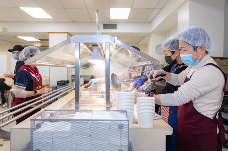 國際佛光會洛杉磯協會督導委員會投入盛粥、分粥及打包工作。為讓會員能夠儘早領到臘八粥,協會統一安排各分會代表依登記順序領取,再由各分會分發給會員。慧東法師親臨現場致意並舀粥打包,督導們笑說:「能拿到這碗粥的佛光人,真是幸運兒」。