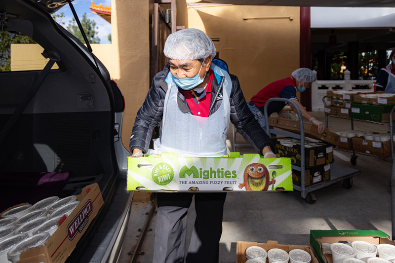除此之外,督導吳帥倫親送臘八粥至聖蓋博市政府(San Gabriel City Hall)。理事錢學儉則親送至核桃市政府(Walnut City Hall)。西來文教館知謙法師也將臘八粥送至文教館周邊的銀行、藥局與診所,分送給工作人員,僧信二眾同心協力集體創作,讓更多人共享佛陀成道的法喜。