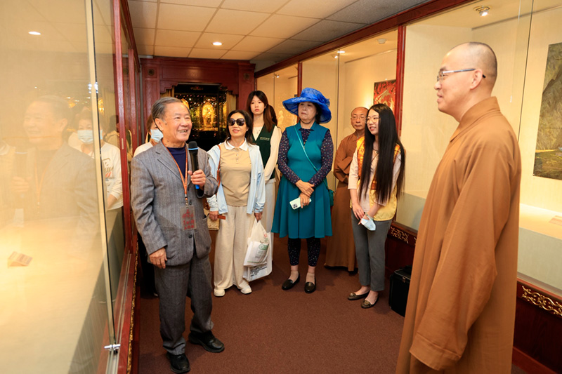 西來寺住持暨佛光緣美術館西來館館長慧東法師(右2)、西來館主任慧軒法師(左1)、與畫家劉榕(中)等合影。