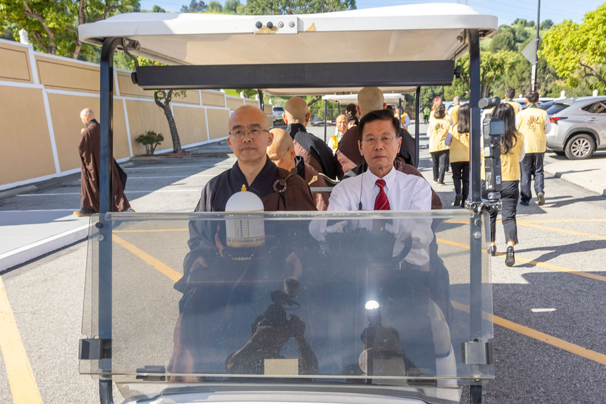 恭奉典禮以及讚頌會皆以中英文全球直播,慧東法師率隨行隊伍繞行道場環山,在五聖殿前由佛光西來童軍團以旗幟儀式致意,再行經成佛大道,大眾合掌禮敬,恭迎大師靈骨安奉大雄寶殿,並將於7月18日迎入祖師堂供奉,屆時將禮請佛光山住持心保和尚主法。