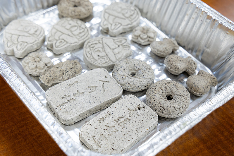 擴香石的製作則是將香粉與顏料混合均勻,再以模具塑型。待完全乾燥後即可散發淡雅香氣,既美觀又實用。