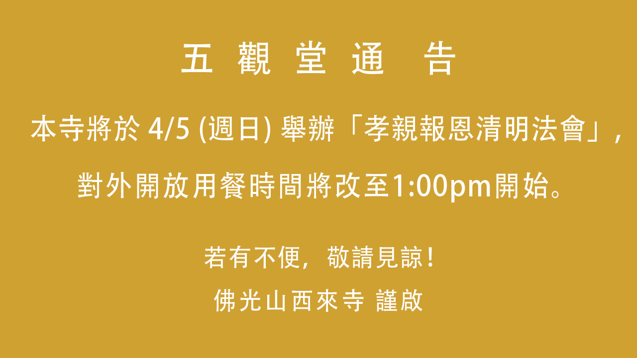 五觀堂4月5日(週日)用餐時間將改至1:00pm開始 2026.4.3